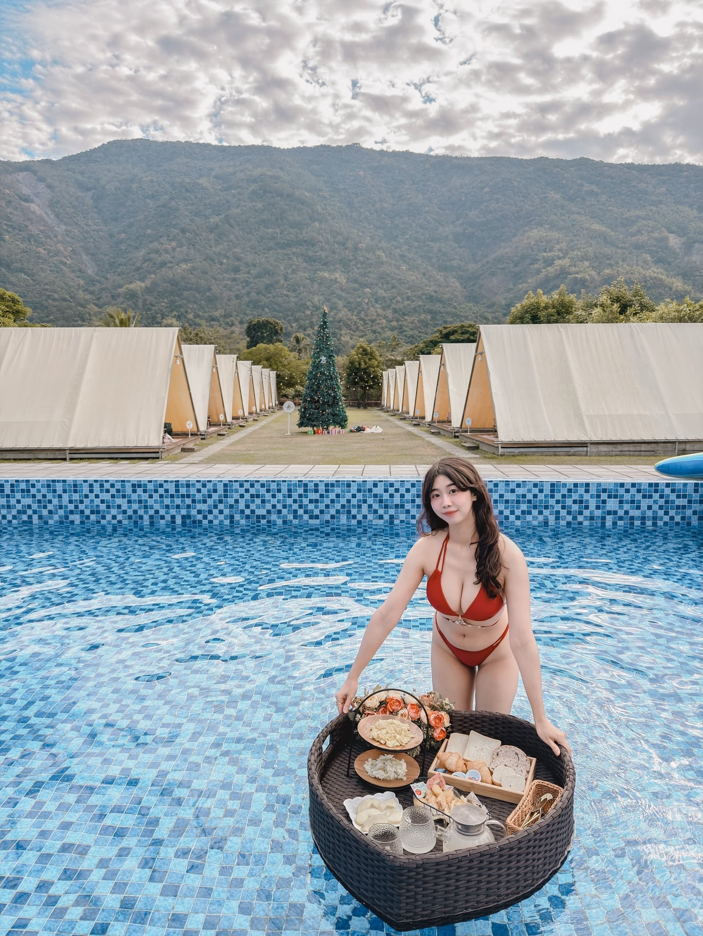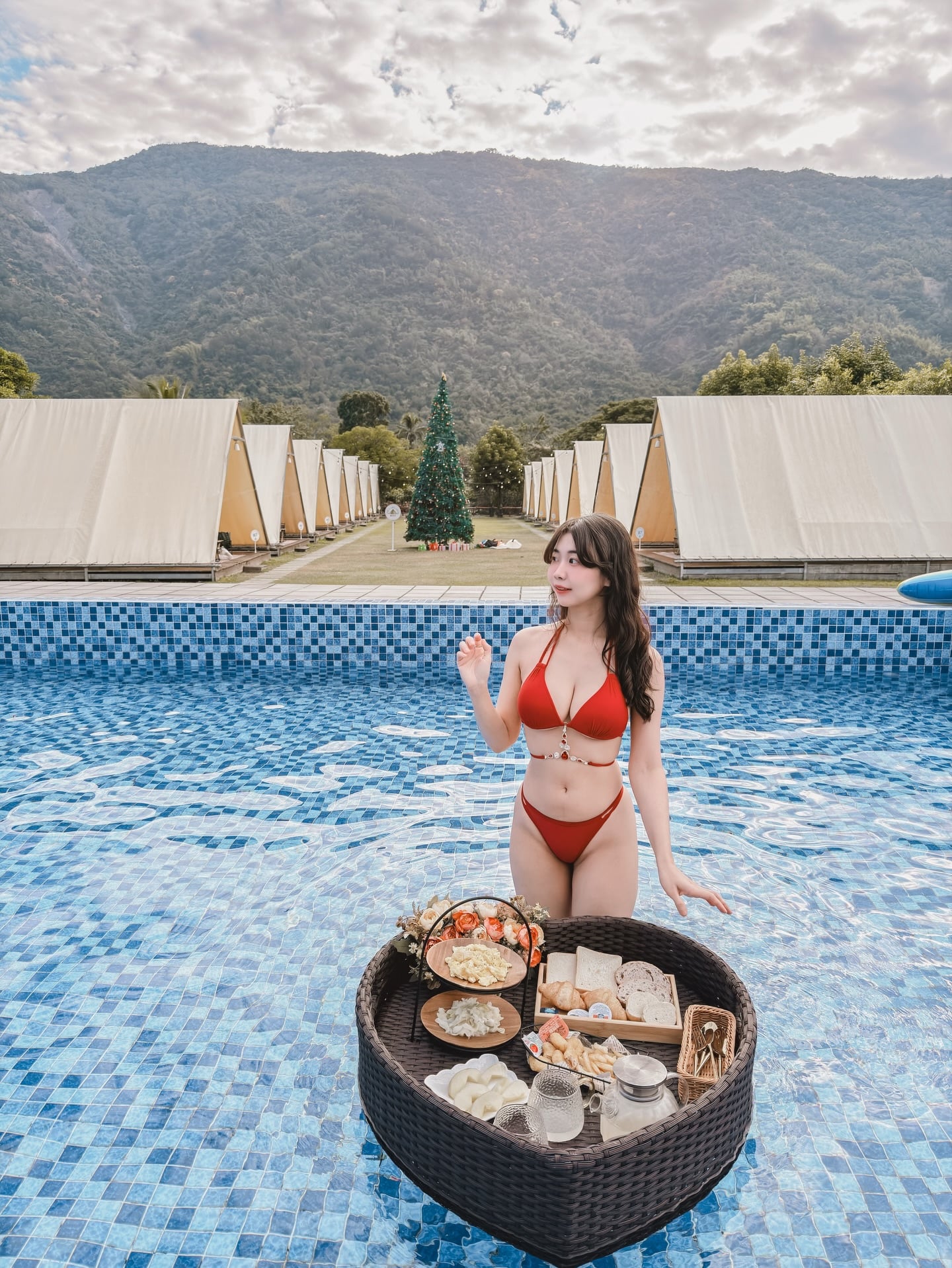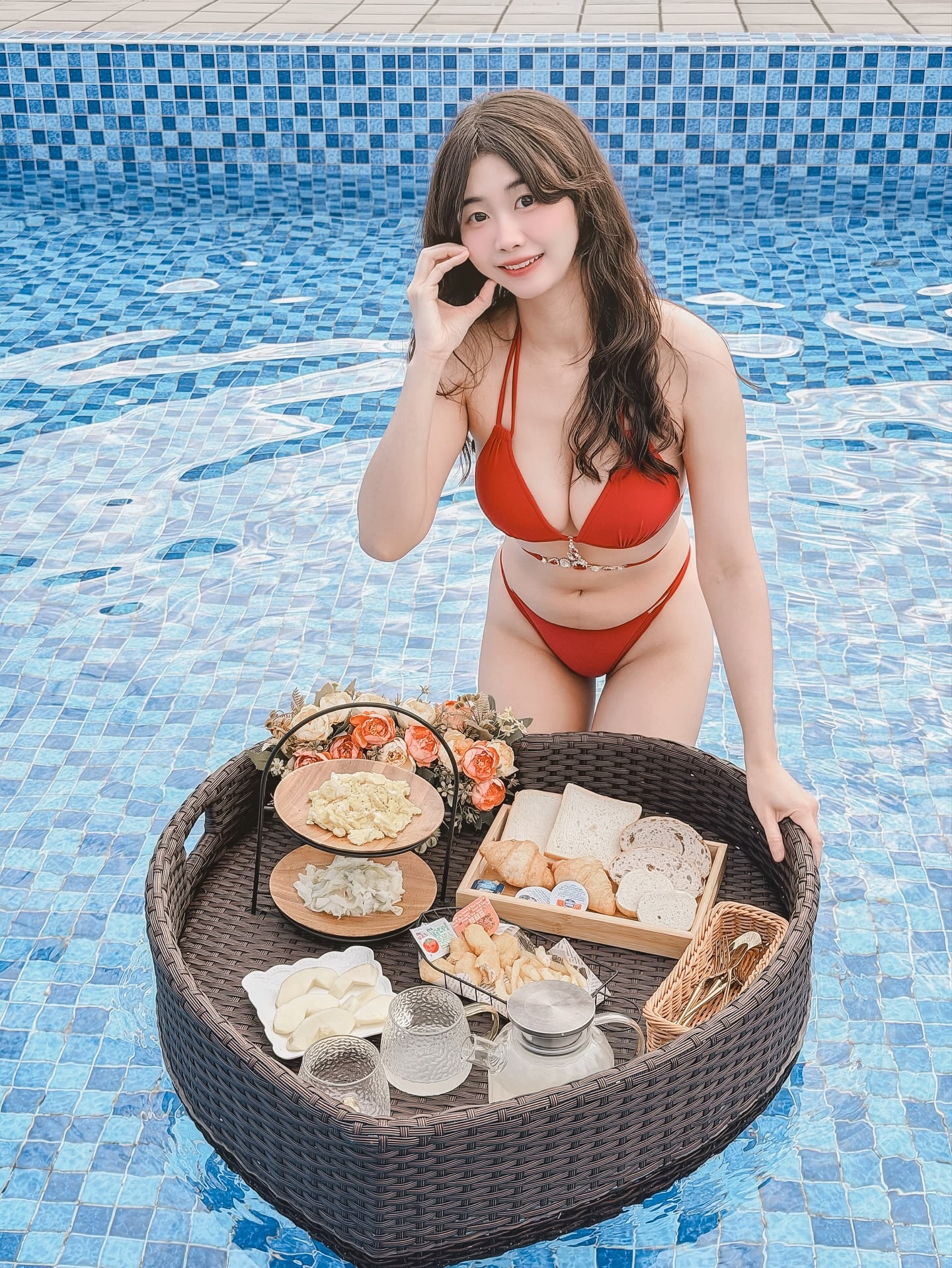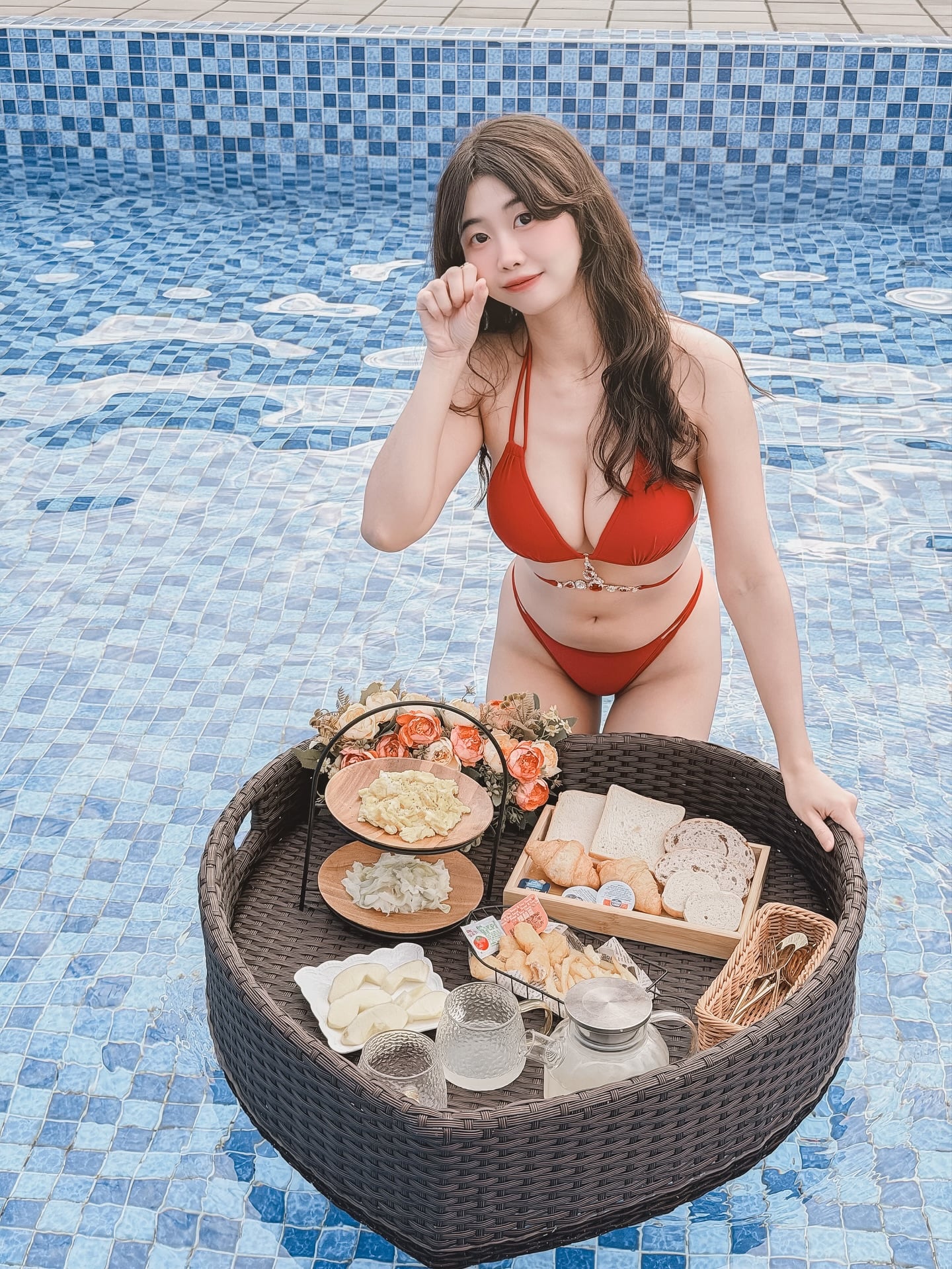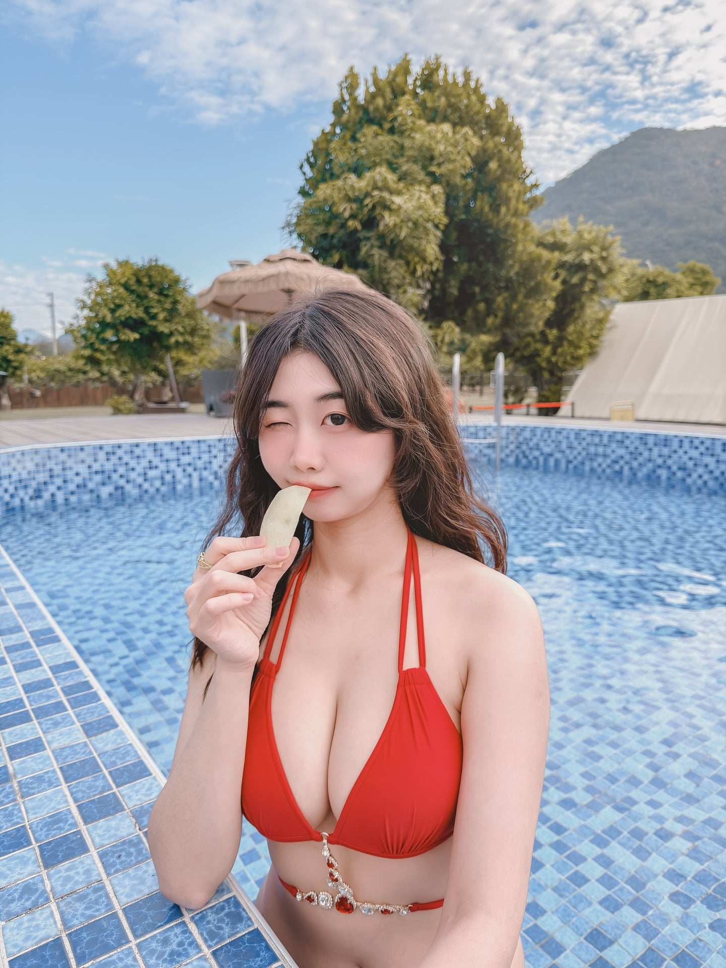 渟渟紅色泳裝外拍照